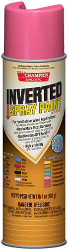 Champion Sprayon® Inverted Paint can be used for handheld applications (accurate marking 5” to 12” above the ground), or with a Champion Sprayon Long or Short Wand. Spray on asphalt, concrete or other paved surfaces, or on dirt, grass or gravel. Lasts 4-6 months, depending upon traffic and exposure.