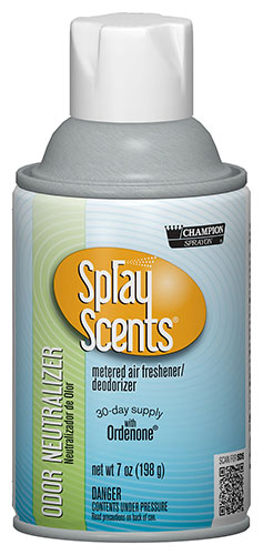 Champion Sprayon® SprayScents® completely eliminate unpleasant odors and leave a clean, fresh scent in the air. Contains Ordenone™, a deodorizing ingredient that is an effective odor eliminator. The measured spray deodorizes up to 6,000 cubic feet. Universal spray tip - our metered air fresheners are manufactured with a universal actuator tip and will fit most metered-aerosol dispensers.